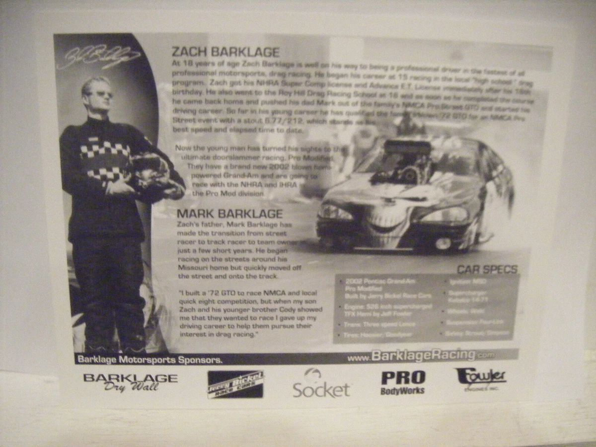 ZACH BARKLAGE PONTIAC GRAND AM NHRA IHRA PRO MOD DRAG RACING